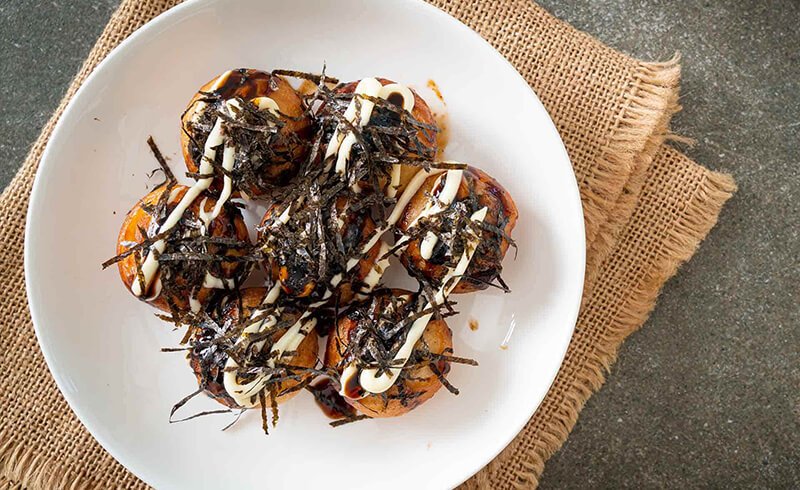 Takoyaki, özellikle Osaka’da çok popüler olan, ahtapot dolgusuyla yapılan yuvarlak hamur toplarıdır. Bu lezzetli atıştırmalıklar, özel bir tavada pişirilir ve üzerine özel sos, mayonez, kuru yosun ve bonito balığı pulları eklenir.
